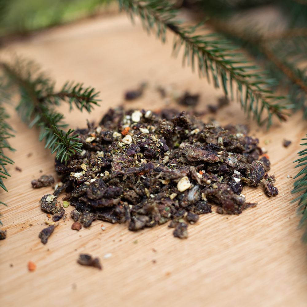 Gras-, Kräuter- und Leguminosenpflanzen gepresst und getrocknet, Möhrentrester, Apfeltrester, Aroniatrester, Schwarze Johannisbeeretrester, Leinsamen, Hagebuttenschalen, Tomate, Rote Bete, Pastinake, Algenkalk, Sellerie, Eschenrinde, Bierhefe, Malzkeime, Birkenblätter, Löwenzahnwurzel und Kraut, Mariendistelkraut, Brennnesselkraut, Seealgenmehl und Traubenkerne extrahiert