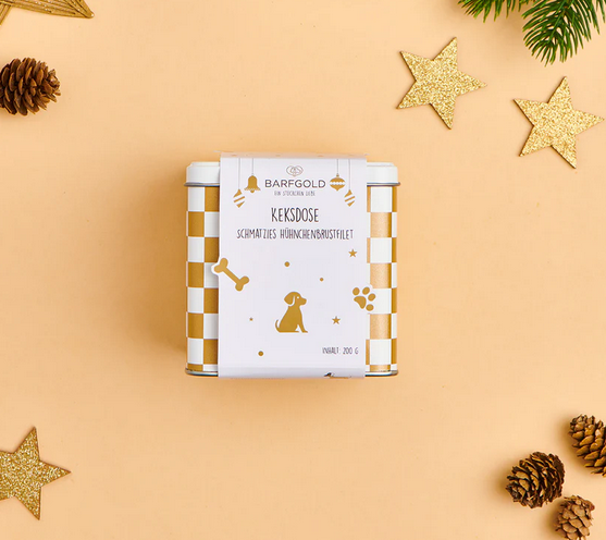 Die festliche Keksdose mit Schmatzies Hähnchenbrustfilet ist ein liebevolles Geschenk für Hunde – oder eine besondere Aufmerksamkeit für den eigenen Vierbeiner in der Weihnachtszeit.
