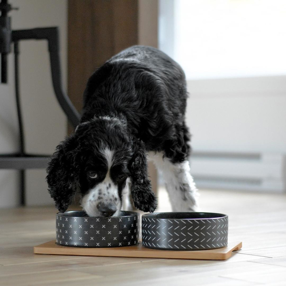 Die Beonebreed Ceramic & Bamboo Duo Bowl Black hat ein einzigartiges, modernes Design aus schwarzen, geprägten Keramikschalen auf einem Bambusbrett. Anti-Rutsch-Pads unter dem Brett halten die Duo Bowl an ihrem Platz.