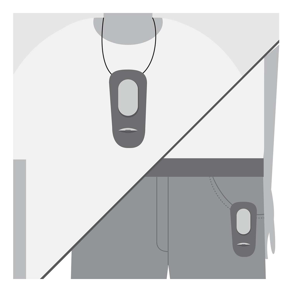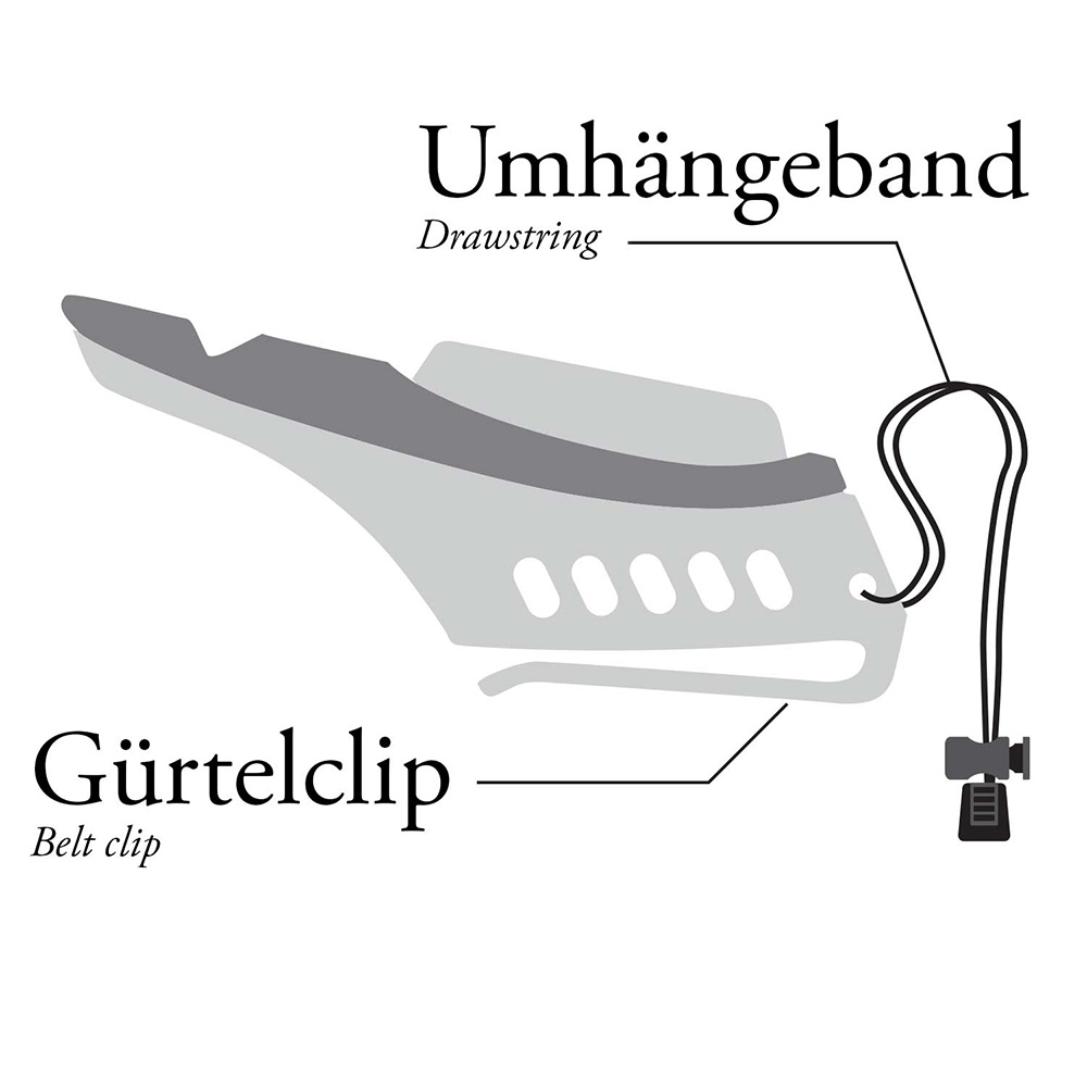 - mit Umhängeband oder Clip variabel an der Kleidung zu befestigen