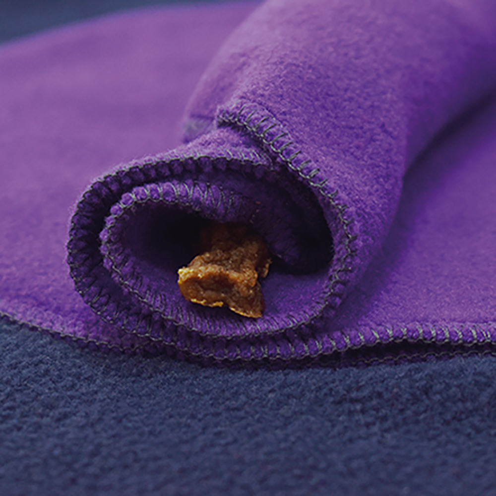 Vergrabe Leckerlis tief zwischen den „Grashalmen", rolle sie zwischen den Stofflagen ein oder versenke sie tief in den Beuteln und Täschchen.