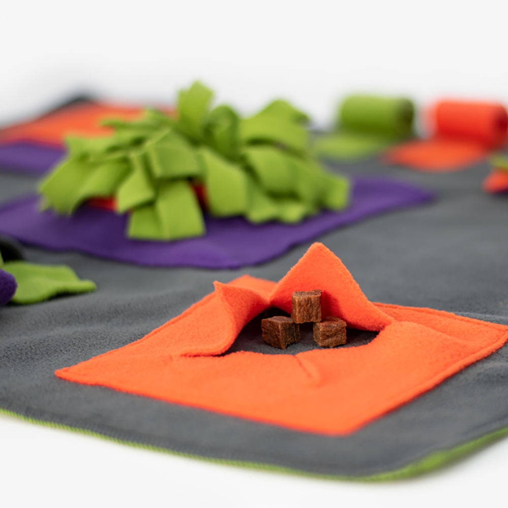 Vergrabe Leckerlis tief zwischen den „Grashalmen", rolle sie zwischen den Stofflagen ein oder versenke sie tief in den Beuteln und Täschchen.