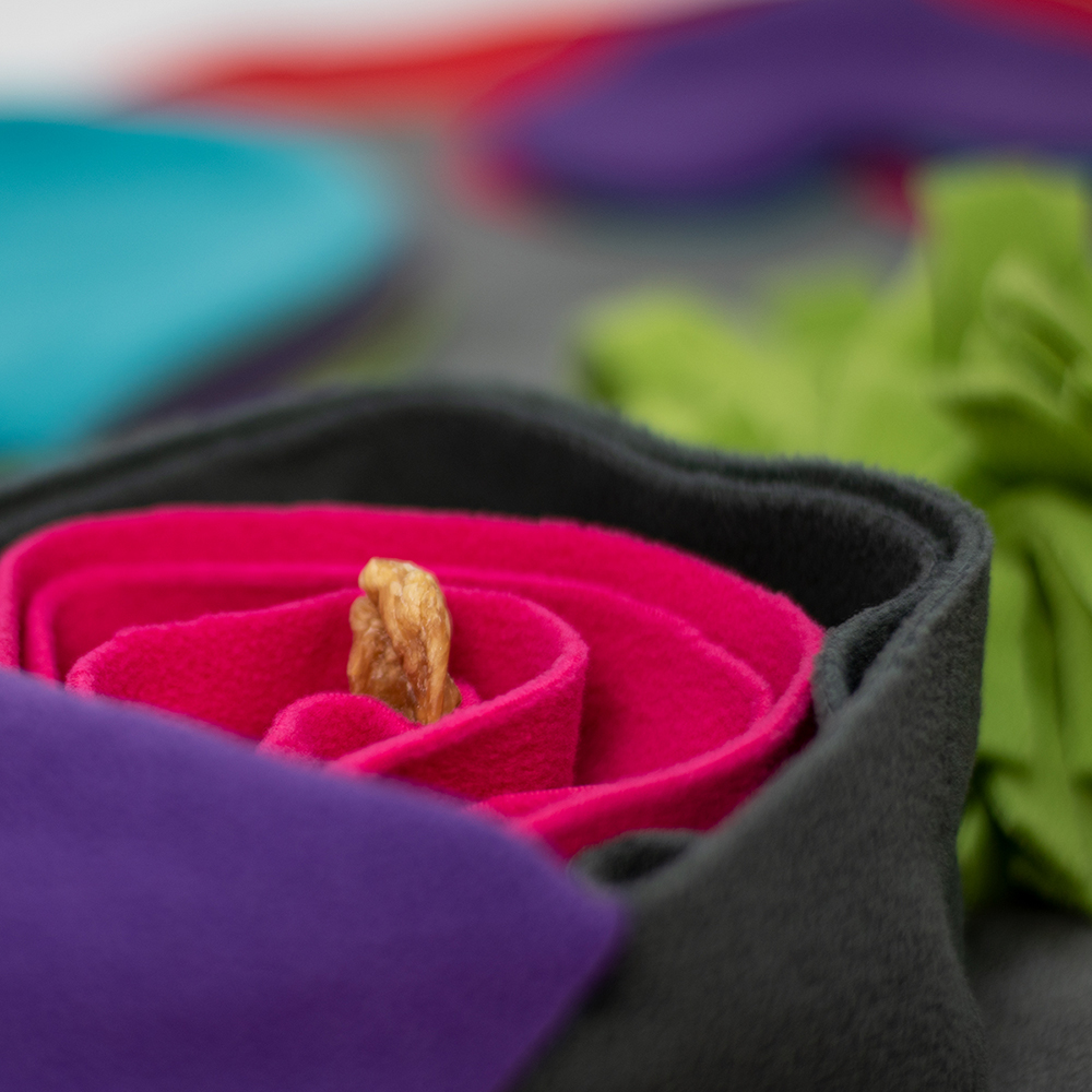 Vergrabe Leckerlis tief zwischen den „Grashalmen", rolle sie zwischen den Stofflagen ein oder versenke sie tief in den Beuteln und Täschchen.