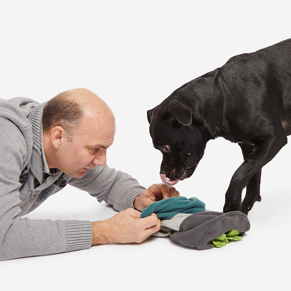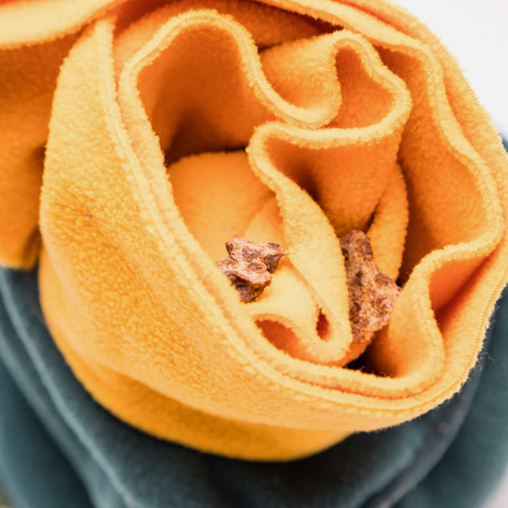 Befülle die Seiten nacheinander oder gleichzeitig. Auch in der Mitte können Leckerlis oder ein kleines Spielzeug versteckt werden. Falte und wende die SNIFFROLL mit jedem neuen Spiel, stülpe Stofflagen nach innen oder außen, oder rolle sie komplett zusammen.