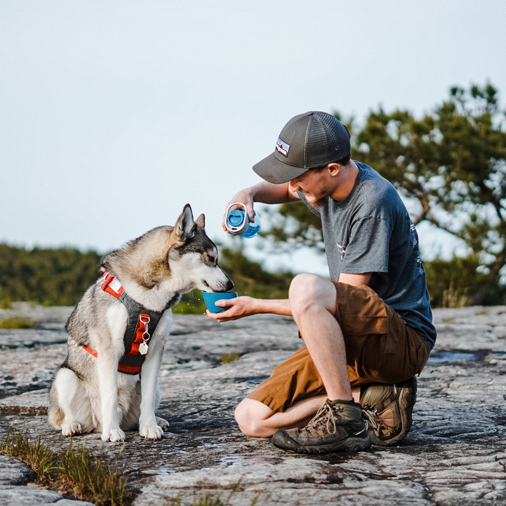 Die Kurgo Gourd H2O Bottle & Bowl ist eine Trinkflasche, aus der Sie auf hygienische Weise trinken und das Wasser auch mit Ihrem Hund teilen können. Wenn Sie die Oberseite aufschieben, können Sie hieraus selbst trinken, und den ausklinkbaren Behälter füllen Sie mit Wasser für Ihren Hund.