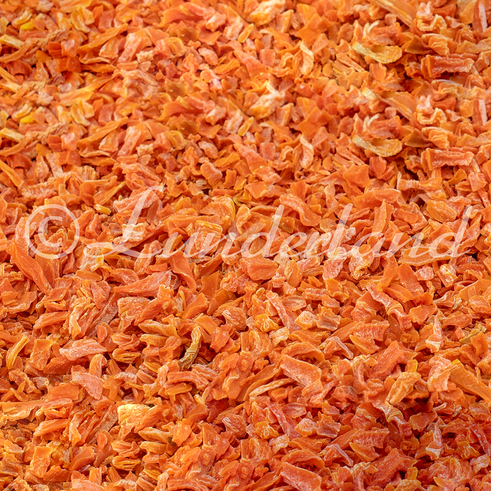Um 100 g frische Karotte zu ersetzen, benötigt man ca. 25 g trockene Mohrrübenraspel und 75 g Wasser.