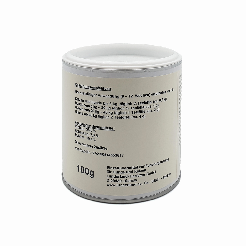 Protein: 53,5 %, Fettgehalt: 10,1 %, Rohasche: 7,0 %