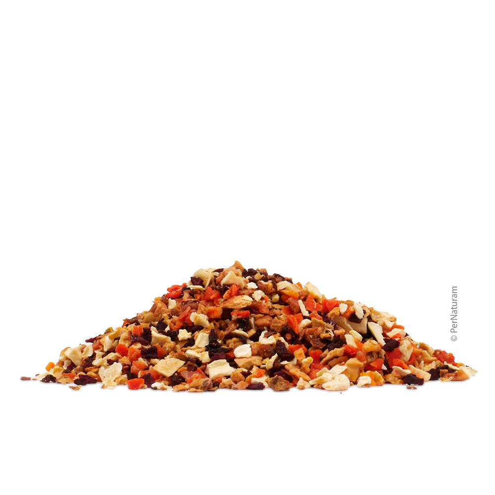 PerNaturam Bauerngarten rot ist eine schonend getrocknete Gemüse- und Früchtemischung. Sie bereichert das Futter mit Mineralien, Spurenelementen und Ballaststoffen. 1 kg entspricht ca. 10 Kilogramm frischem Gemüse und Früchten.