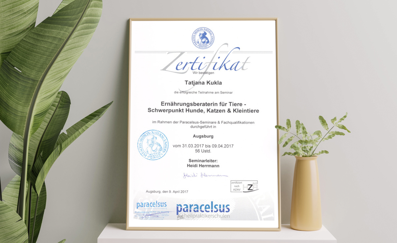 Gesunde und artgerechte Ernährung steht im Vordergrund mit allen notwendigen Ergänzungsfuttermittel. Aus diesem Grunde haben wir unterschiedliche Zertifikate erlangt und Weiterbildungen im Bereich Hundeernährung besucht! Individuelle Bedürfnisse erfordern auch individuelle Ernährungspläne auf den Energiebedarf des Hundes abgestimmt. Eine Rationsüberprüfung zeigt sehr schnell, ob der Hund optimal versorgt ist und deckt Versorgungslücken auf. Versorgungslücken können zu gesundheitlichen Problemen führen. Oftmals kann man aber auch durch ein paar sinnvolle Zusätze aus einem Fertigfutter eine ausgewogene Ration zaubern.