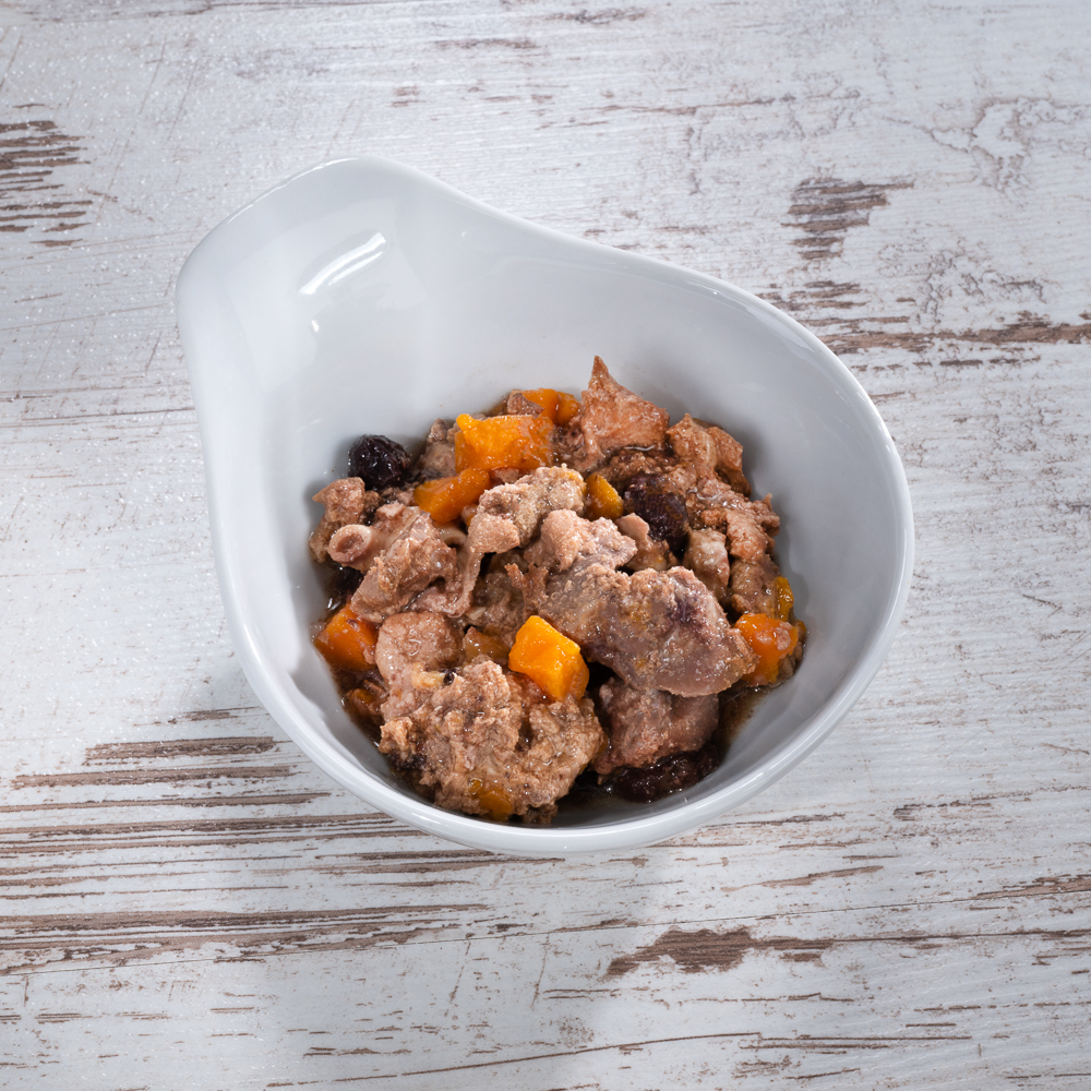 Wildes Land Ragout Ente & Pute mit Süßkartoffeln, Heidelbeeren, Ringelblume & Lachsöl 180g